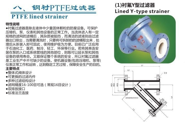Y型襯四氟過濾器,襯四氟Y型過濾器是從流體中分離固體顆粒雜質,提 高 產品純度,保護設備(壓縮機、泵、儀表等)工作的產品。襯氟過濾器采用閥體內構件均為襯里部件,內壁及濾芯均采用耐腐蝕性的聚丙烯或四氟制成,用來去除腐蝕性介質中的雜質,保護泵、閥門及其它設備的正常使用。過濾量:0.5-100T/H,濾器使用壓力:0.1-0.6MPa,濾機規格芯數:1、3、5、7、9、11、13、15、18、21、25、30、40、50、80,濾器使用溫度:5-120°C,濾芯的特點及應用:聚四氟乙烯膜(PTFE)濾芯,聚偏膜(HE)濾芯,聚丙烯膜(PP)濾芯,醋 酸纖維膜(CN-CA)濾芯,長度有10;20;30和40英寸(即2 50;500;750;1000mm),過濾孔徑有:0.1um、0.22um、1um、3um、5um、10um,上述濾芯,耐壓為0.42mpa,可反沖接口方式有插 入式(222、226座二種)和平嘴式多種濾器材質為不銹鋼(304或316L)其特點是體積小、重量輕、使用方便、過濾面積大、堵塞率低、過濾速度快、熱稀穩定性及化學穩定好分疏水性(適用于氣體)和親水性(適用于液體)濾芯,可根據需要選用